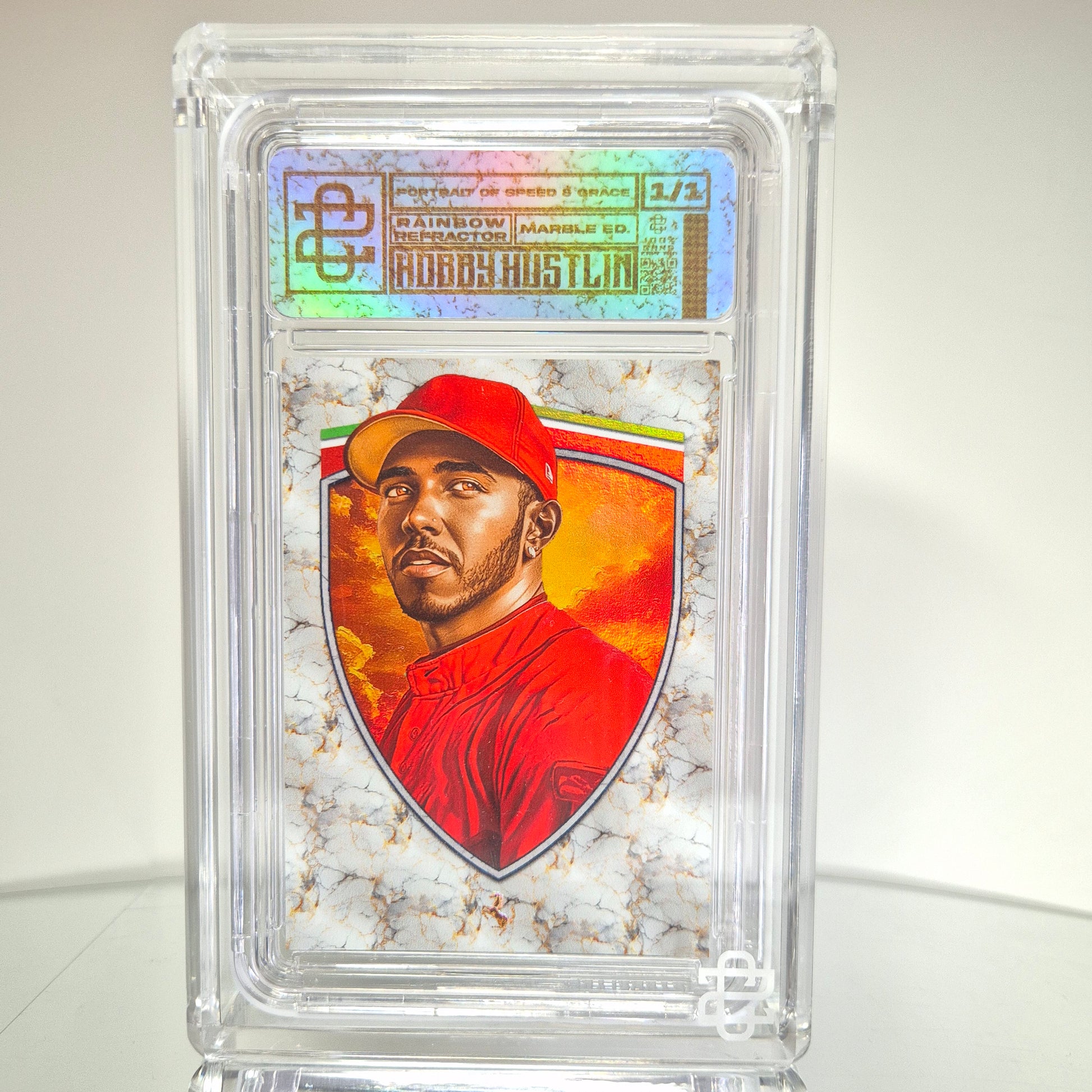 All 1/1 cards are delivered in branded black boxes, in their slab, and with a label identifying the card and its specifications. The cards are hand-signed by the artist on the back, come with a certificate of authenticity
