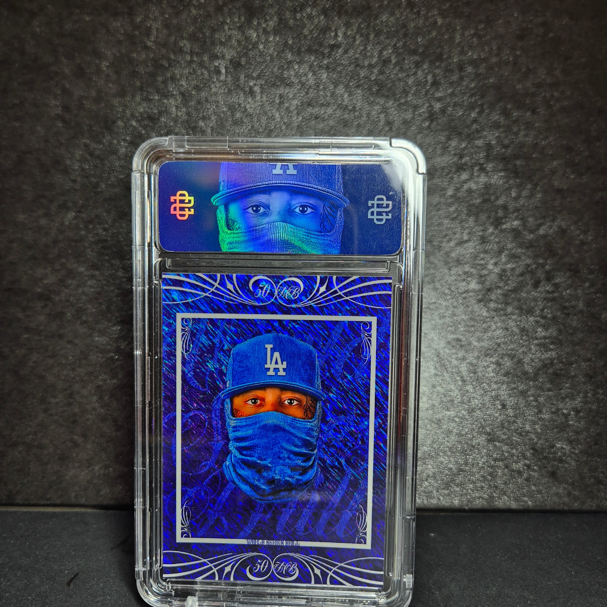 All 1/1 cards are delivered in branded black boxes, in their slab, and with a label identifying the card and its specifications. The cards are hand-signed by the artist on the back, come with a certificate of authenticity