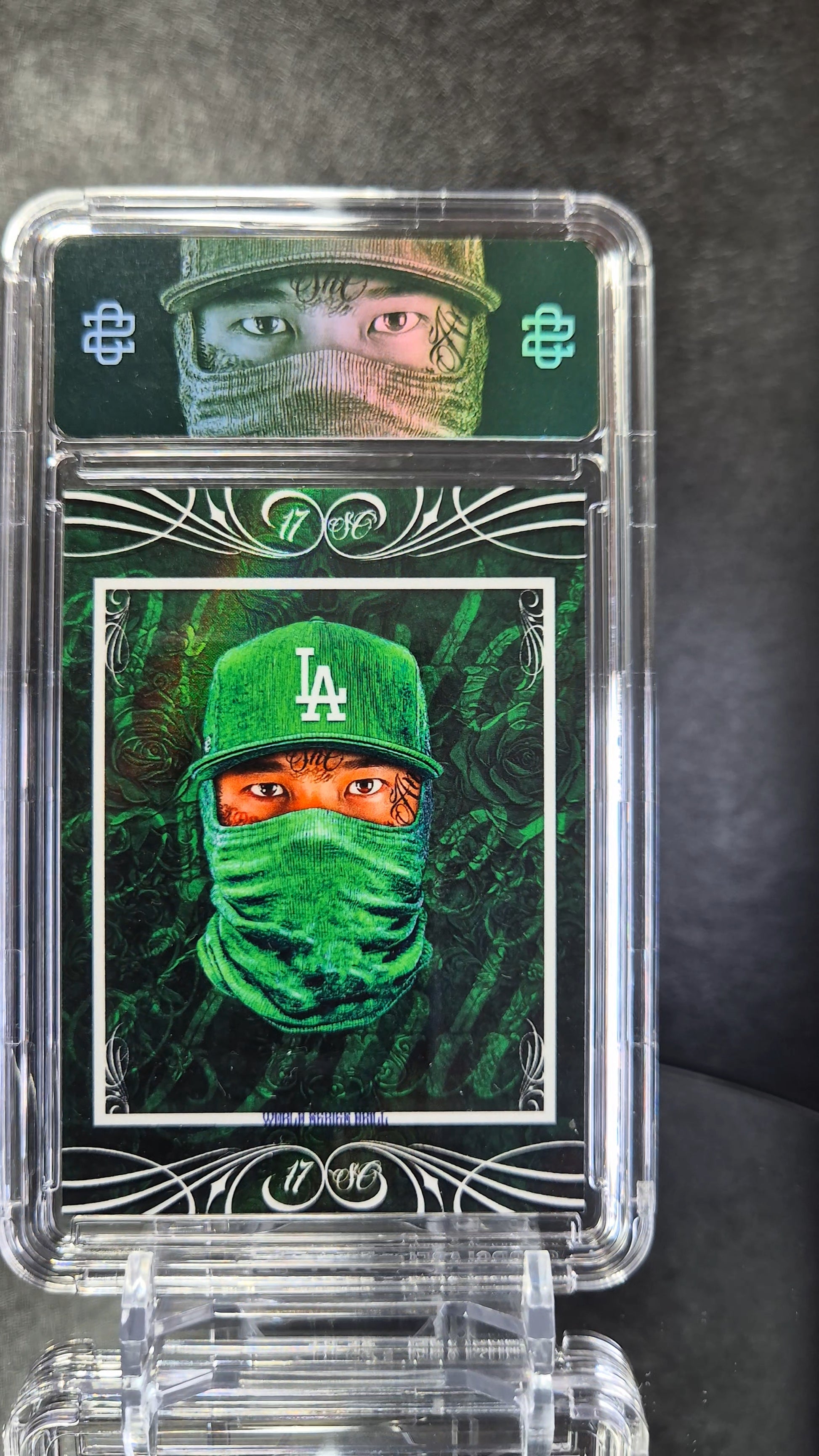 All 1/1 cards are delivered in branded black boxes, in their slab, and with a label identifying the card and its specifications. The cards are hand-signed by the artist on the back, come with a certificate of authenticity