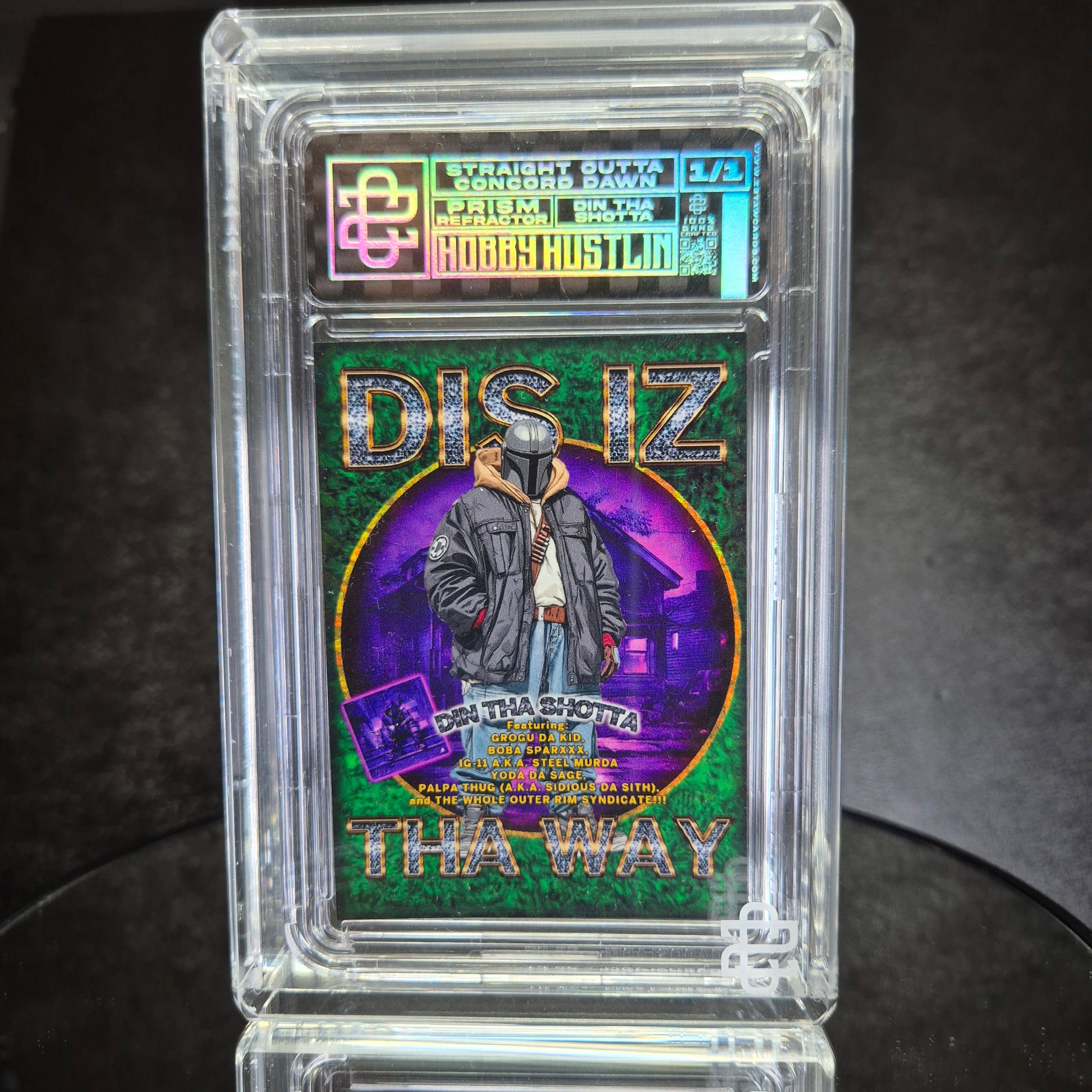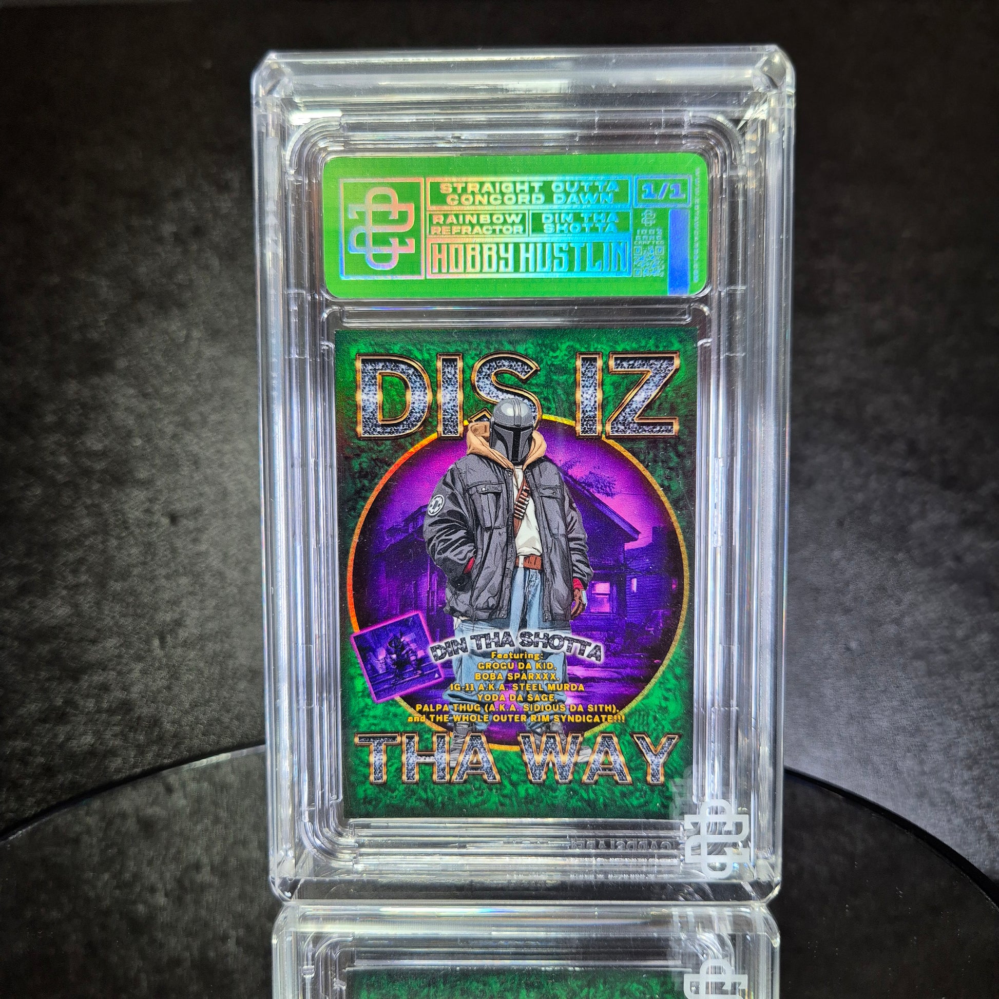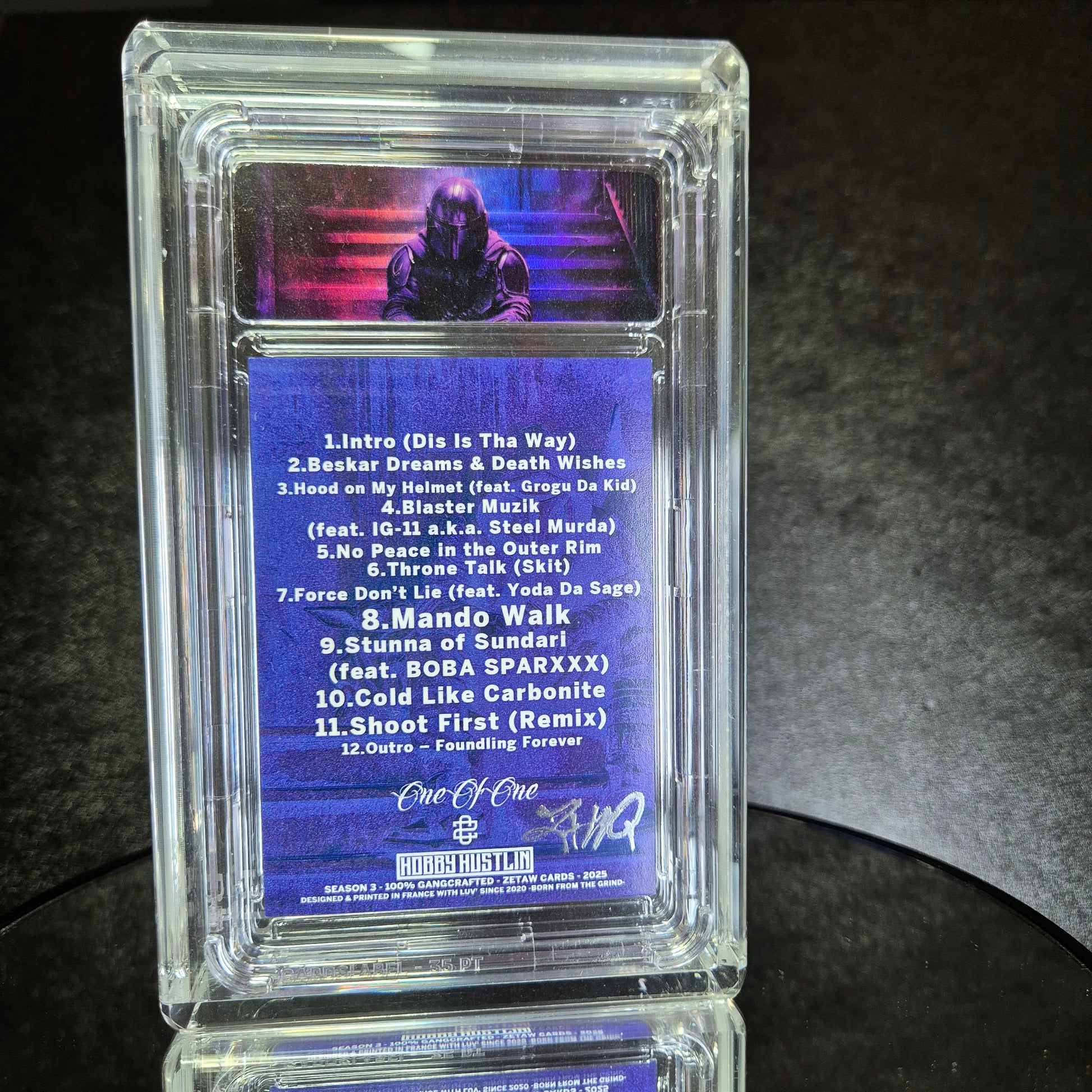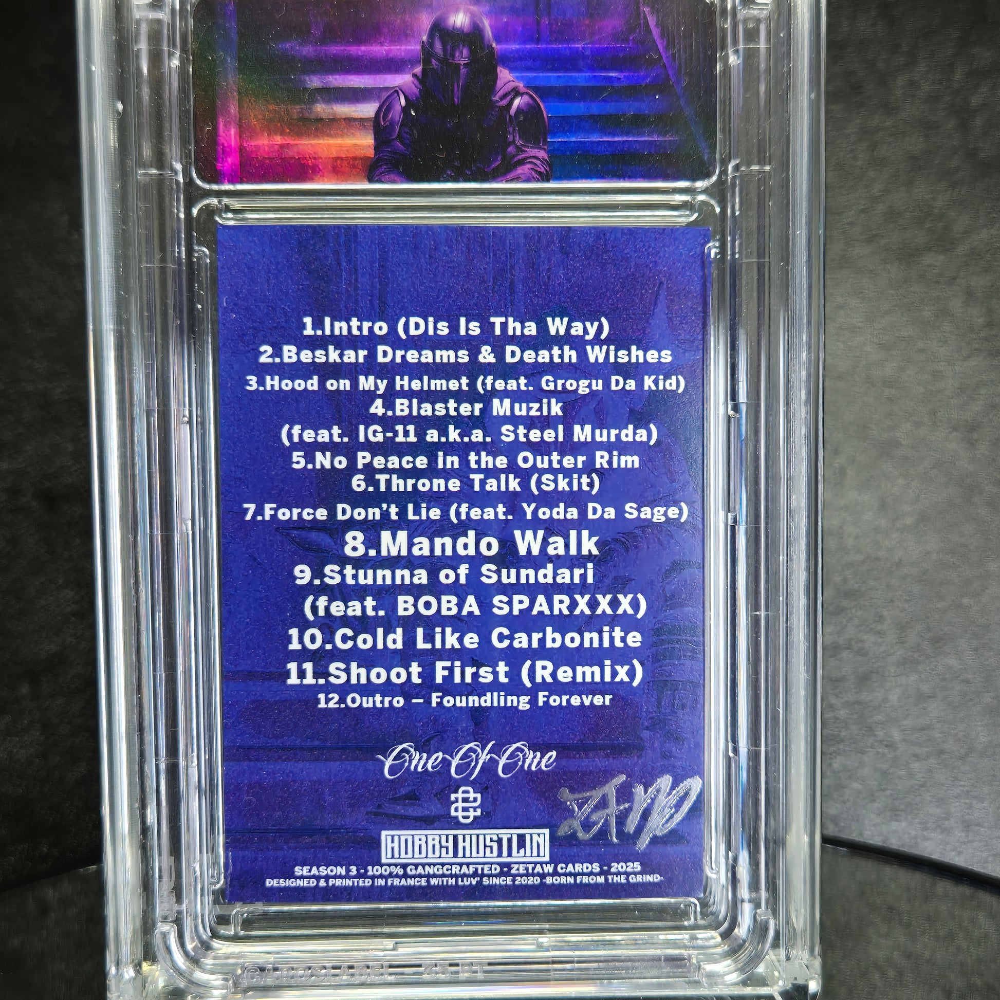 All 1/1 cards are delivered in branded black boxes, in their slab, and with a label identifying the card and its specifications. The cards are hand-signed by the artist on the back, come with a certificate of authenticity